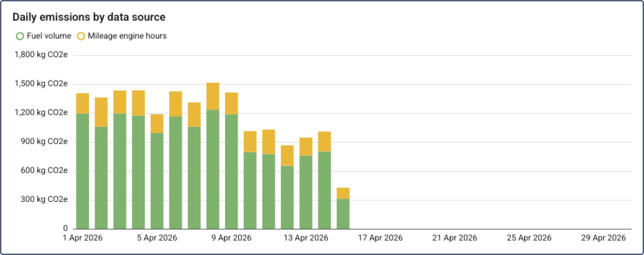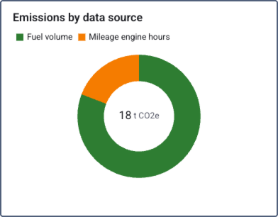 Emissions by data source (bar chart): Shows how total emissions are distributed by data source over time. It lets users compare emissions calculated from fuel volume data and emissions estimated from mileage or engine hours within the same reporting period. This helps assess the accuracy of emissions reporting and identify vehicles that could benefit from adding a fuel volume sensor for more precise calculations.