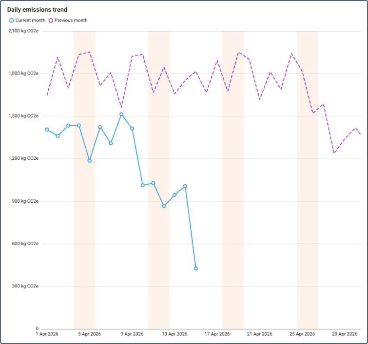 Emissions trend (line chart): Visualizes total CO2e emissions over the selected time period as a line chart. If necessary, use the Show previous period toggle to display a comparison line for the previous period. This helps track progress toward emissions reduction targets and identify seasonal patterns or anomalies.