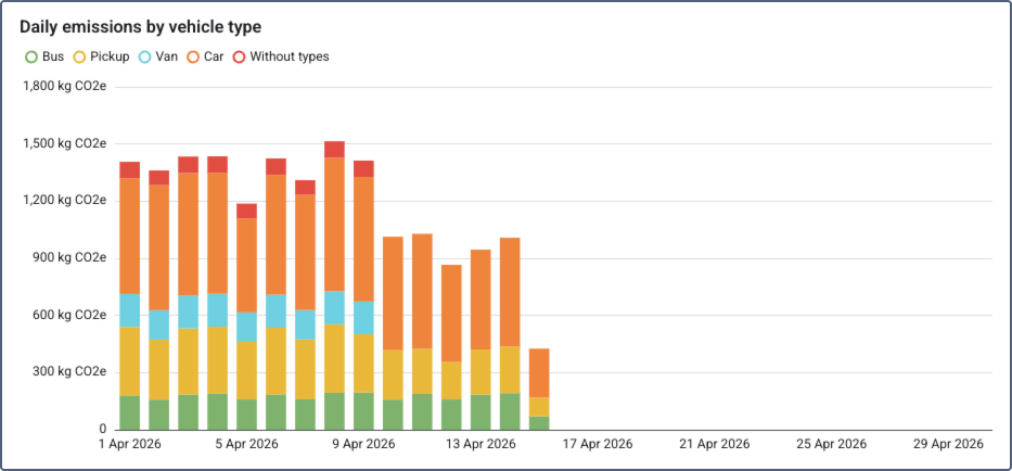 Emissions by vehicle type (bar chart): Shows the distribution of calculated CO2e emissions broken down by vehicle type. Devices without an assigned vehicle type appear under the “Without types” category. This helps identify which vehicle categories are the largest emitters and prioritize fleet renewal or replacement decisions.