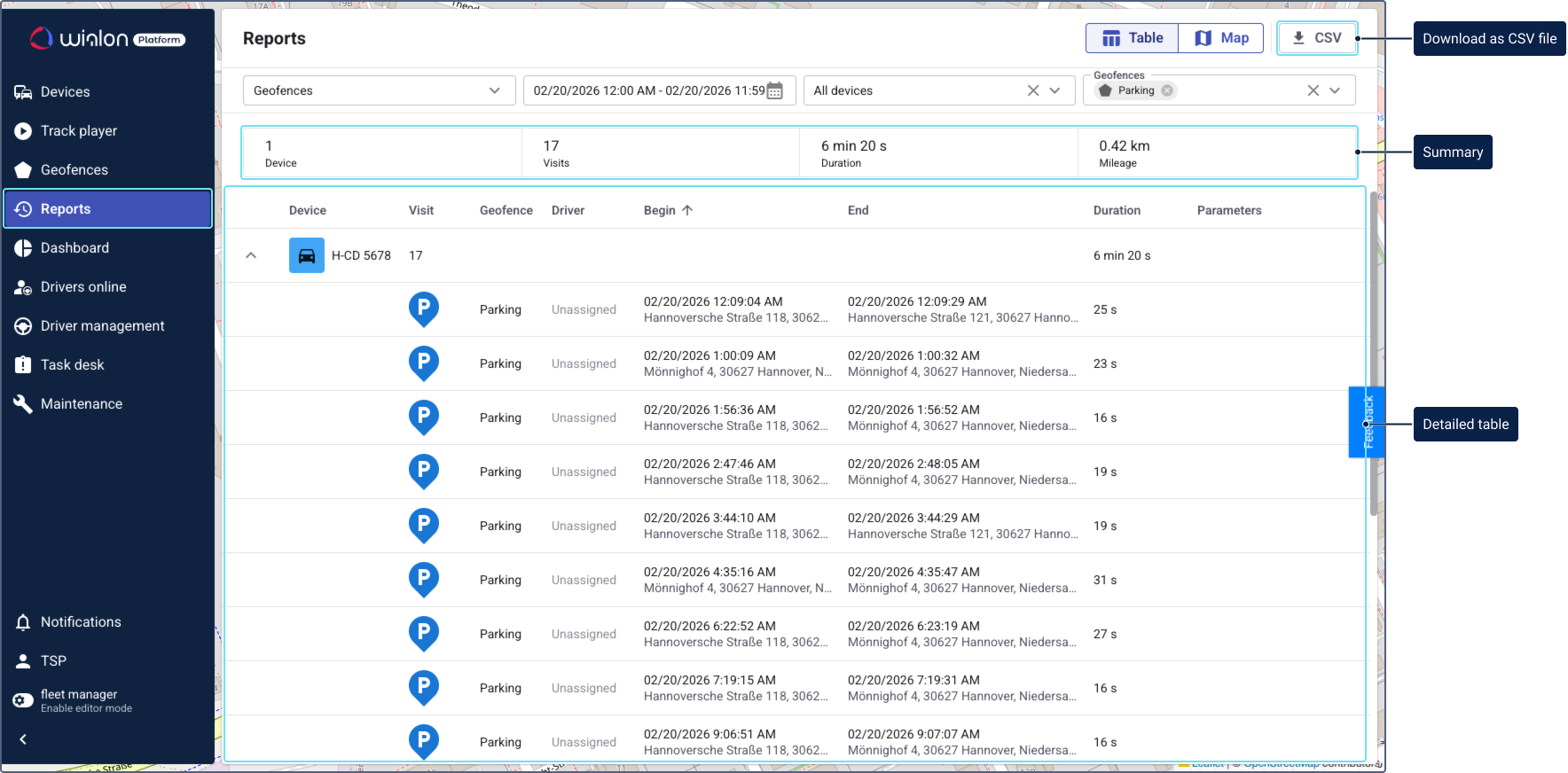 The report is generated automatically, displaying data filtered by your selected devices, time period, and geofences. You can navigate to other pages and return to your report. The generated report is available for 1 minute.