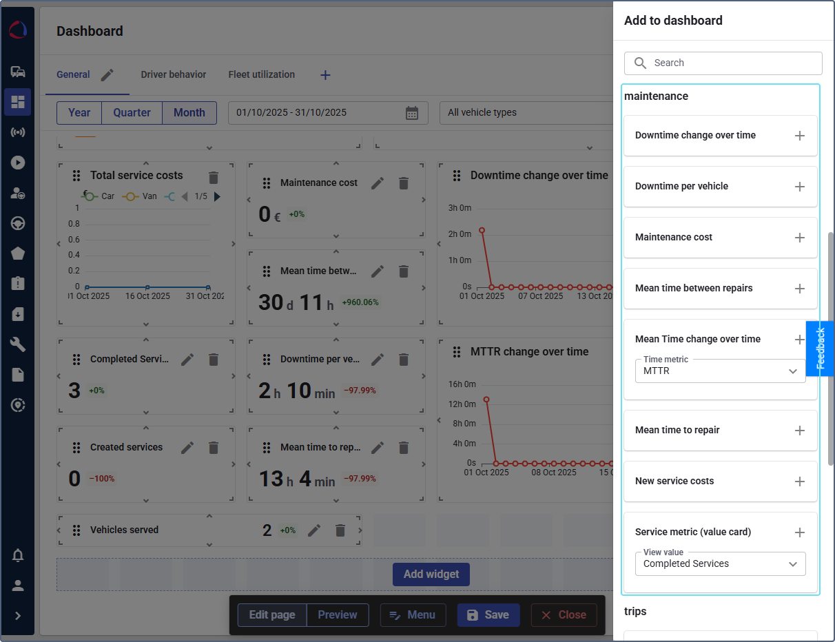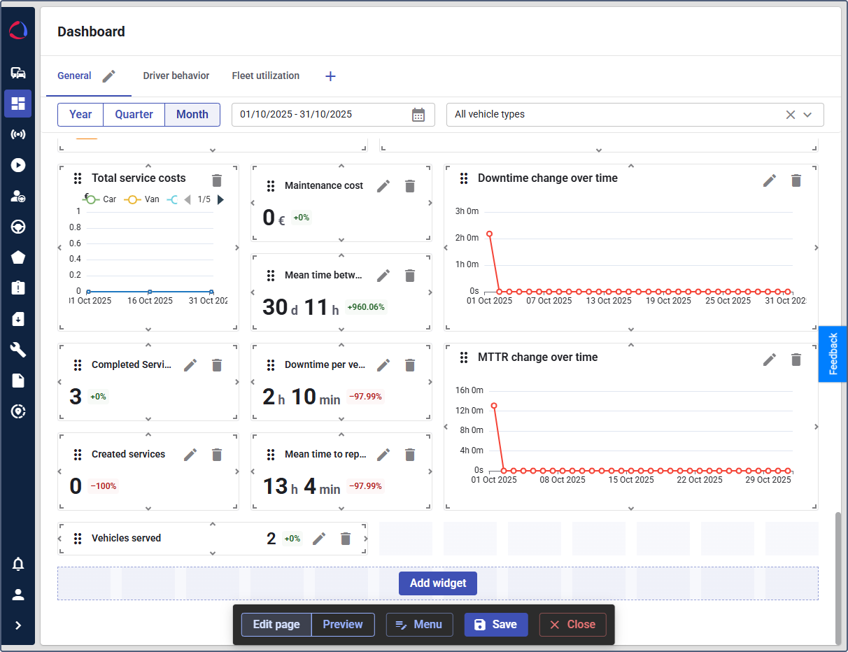- Mean time to repair: Displays the average time it takes to repair a vehicle.