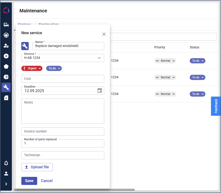 - Set the additional properties defined by your service provider in Wialon Platform Studio. Click Upload file to attach relevant documents, such as photos of the damage, parts invoices, warranties and receipts.
