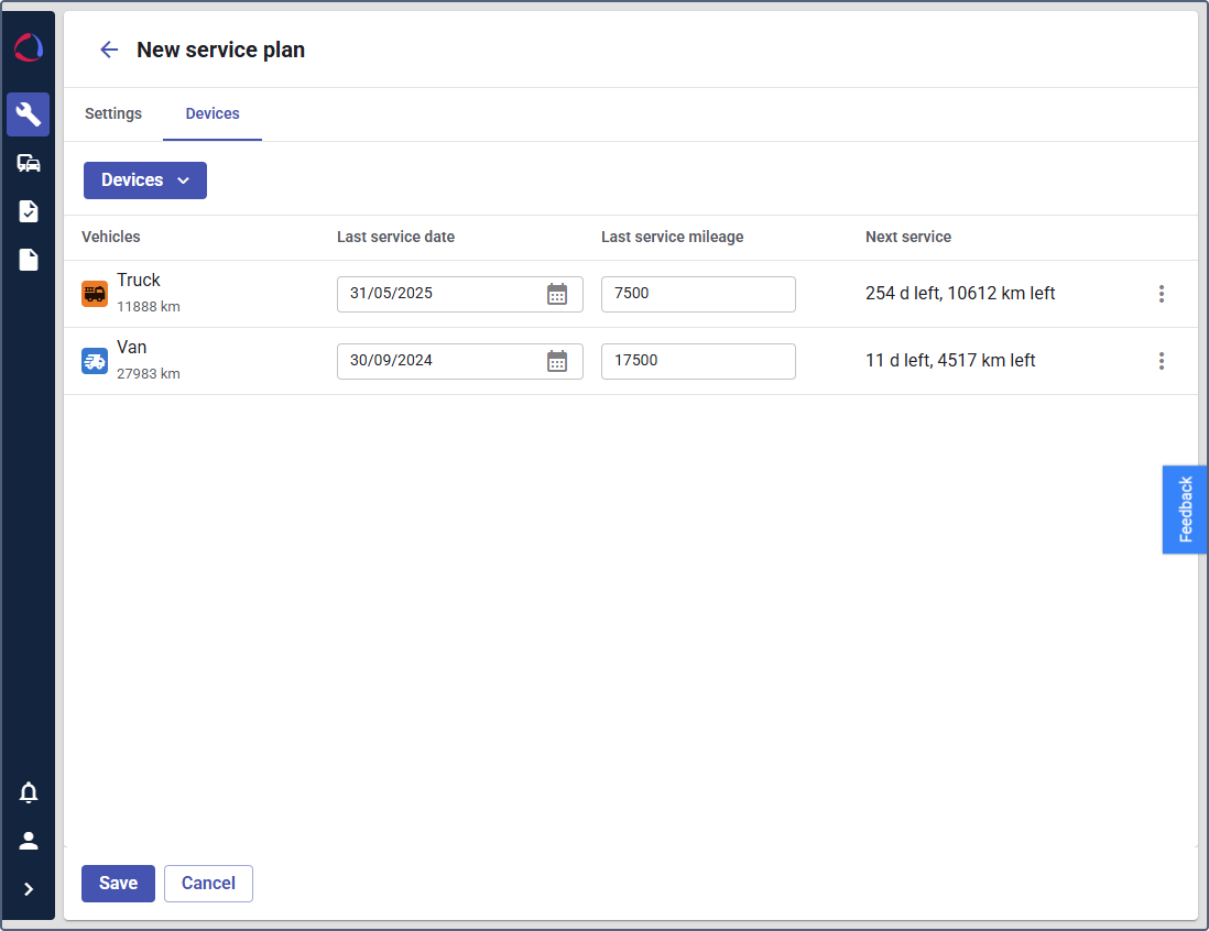 In the Next service column, the system will automatically calculate and display the remaining days or mileage until the next service is due.