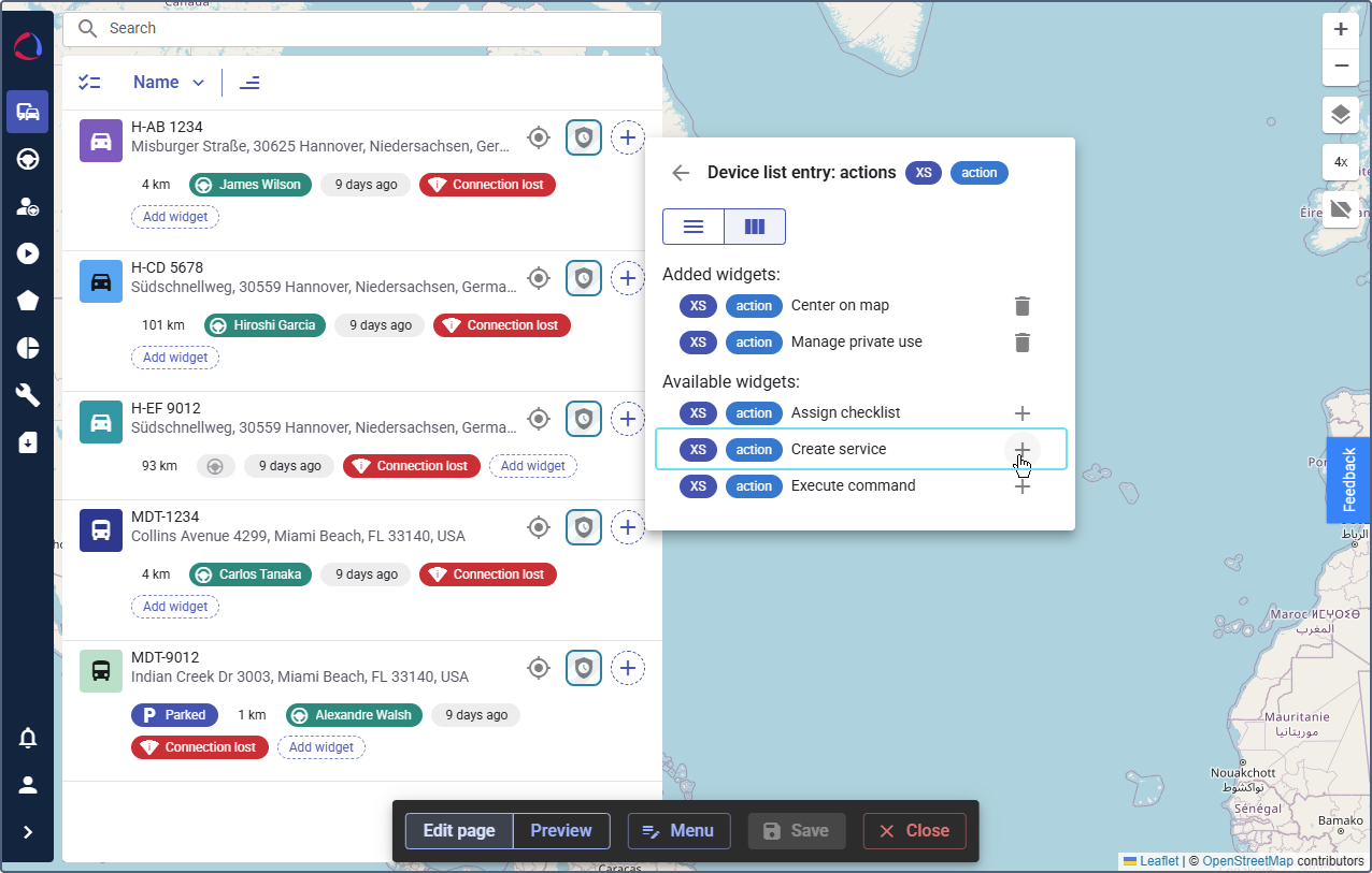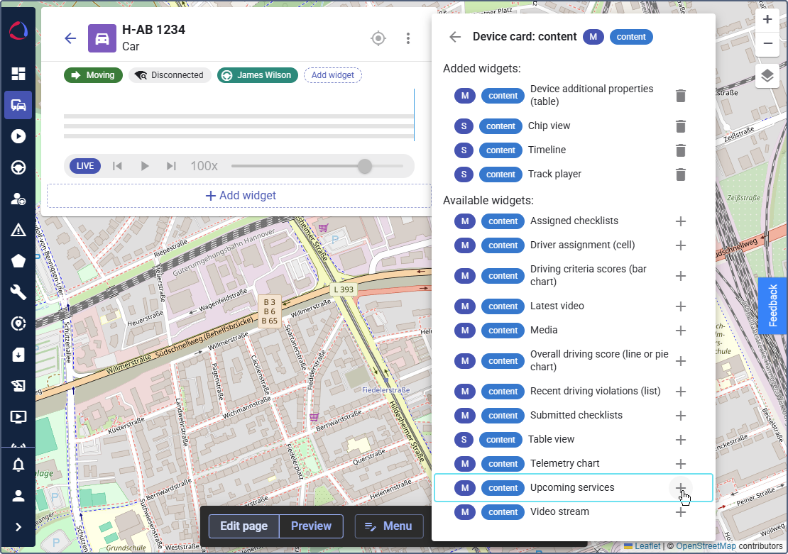 To display maintenance-related information in Wialon Platform FleetSpace, you can configure the Create service action on the Devices and Drivers online pages. In the device and driver details, you can configure the Upcoming services list.