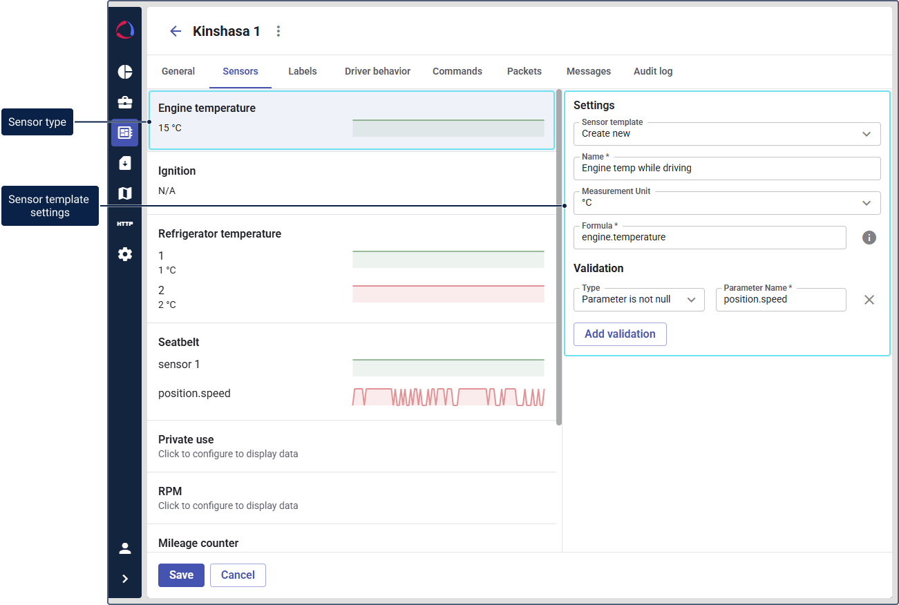 - Select a sensor type to define which telemetry data you want to track for a specific vehicle.