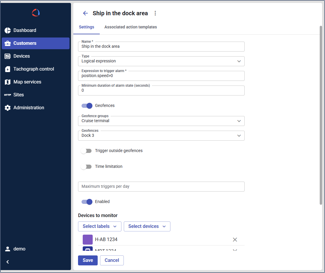 In the Selected devices section, assign the automation to the devices you want to track. You can also select labels (for example, monitor only ships with a specific status, such as
