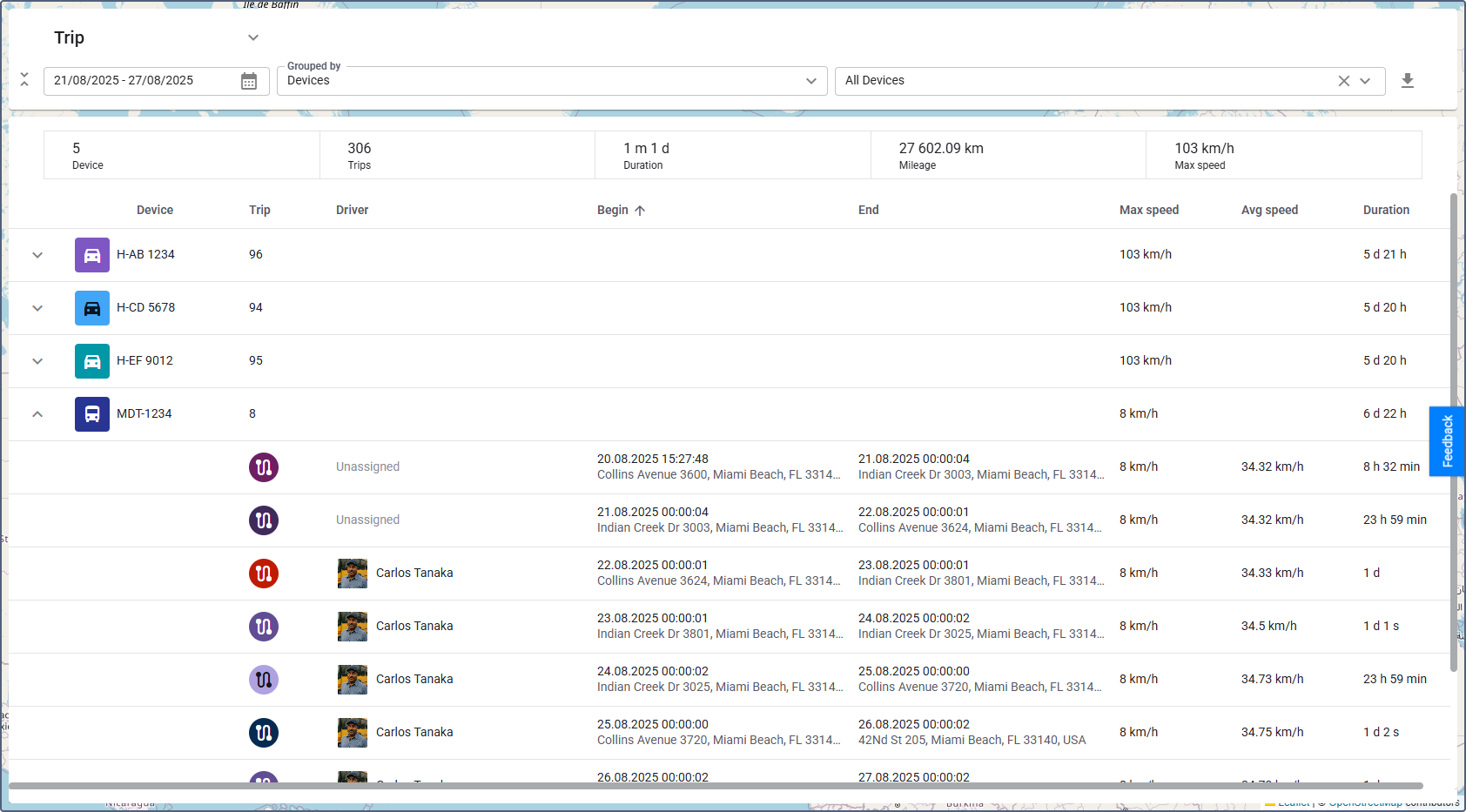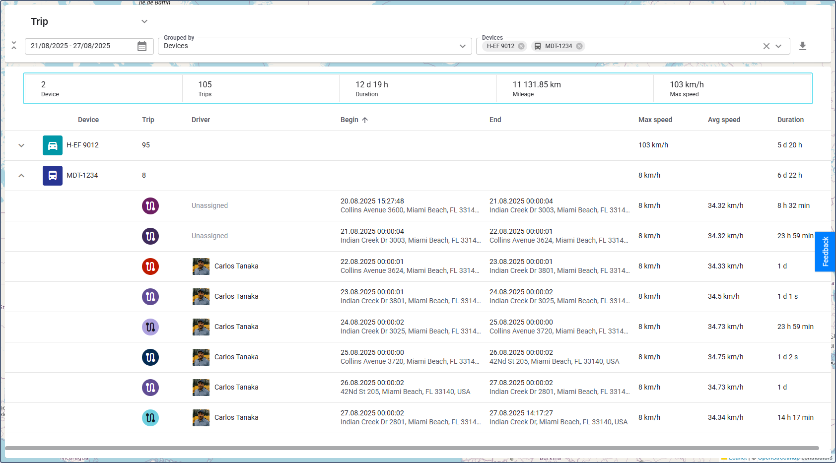 You can expand each device to view its individual trips.