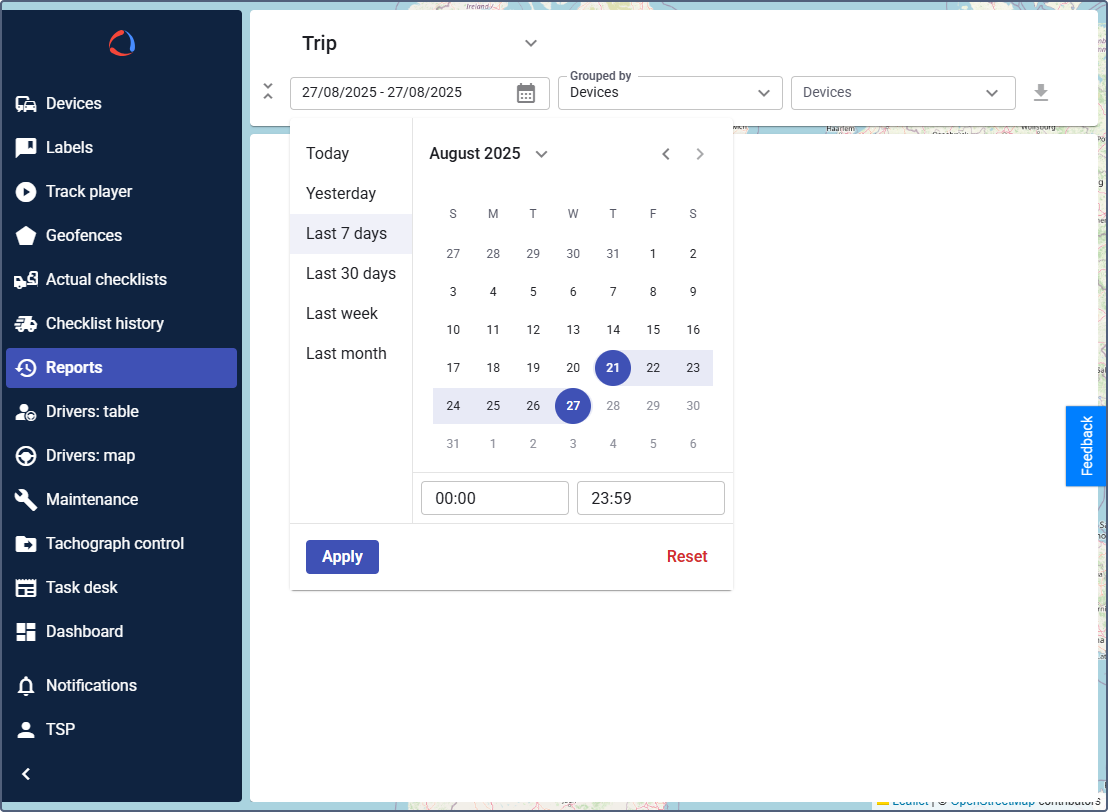 - (For the Trips report only): In the Grouped by field, select whether to group the results by drivers or devices. Other report types may not require this option.