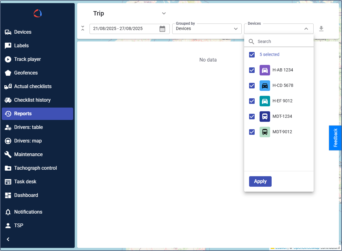 - Device: Device name (expand/collapse to view trips).