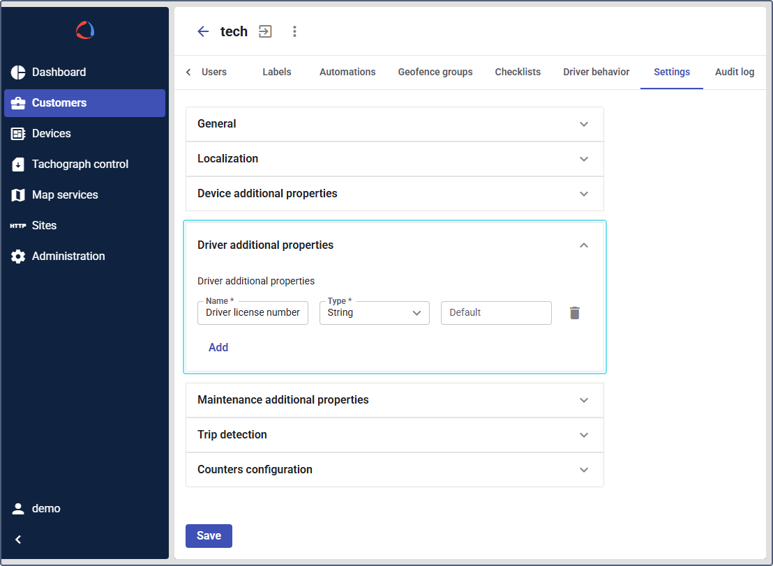 Configuring additional properties allows service providers to tailor driver profiles to specific customer needs, ensuring all necessary information for efficient fleet management is captured.