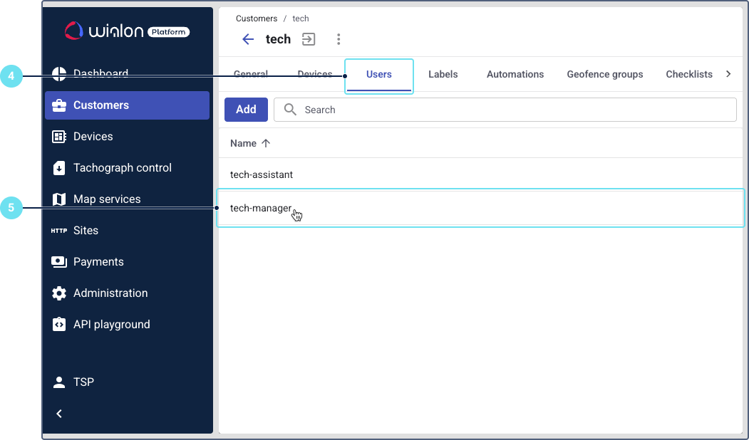 - Select the specific user profile you wish to modify by clicking on their name, or click Add to create a new user.
