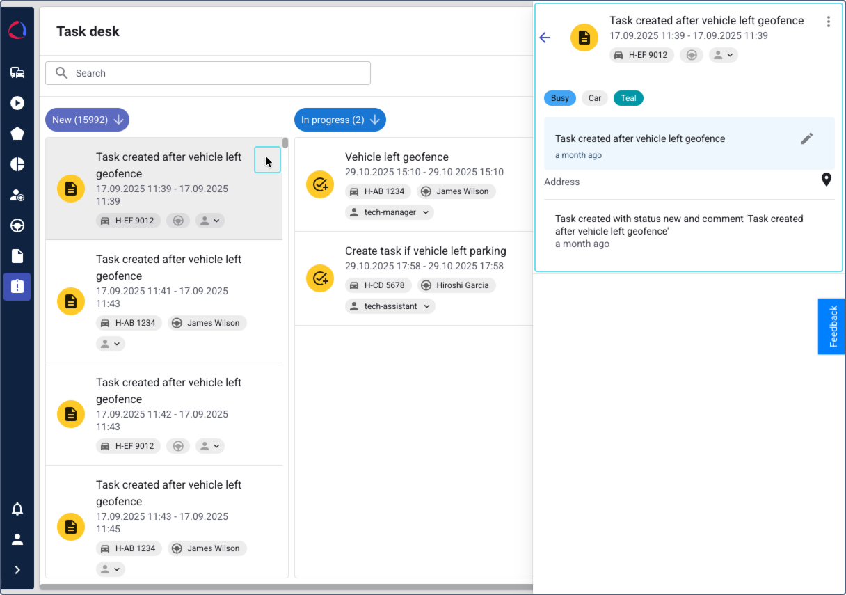 This page describes how to manage and resolve incidents, referred to as tasks, that are automatically generated by the system based on predefined triggers. The Task desk page in Wialon Platform FleetSpace allows users to track, update, and document the resolution of these tasks, ensuring efficient fleet operations and timely responses to critical events.