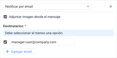 Algunos tipos de dispositivos permiten adjuntar una imagen al correo electrónico enviado por la unidad en el mensaje después del cual se activó la notificación. Para hacer esto, habilite la opción Adjuntar imagen del mensaje activador.