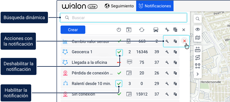Indica si la notificación está habilitada o deshabilitada . Al hacer clic en él se alterna el estado. Use el ícono en el encabezado para cambiar el estado de todas las notificaciones a la vez. |