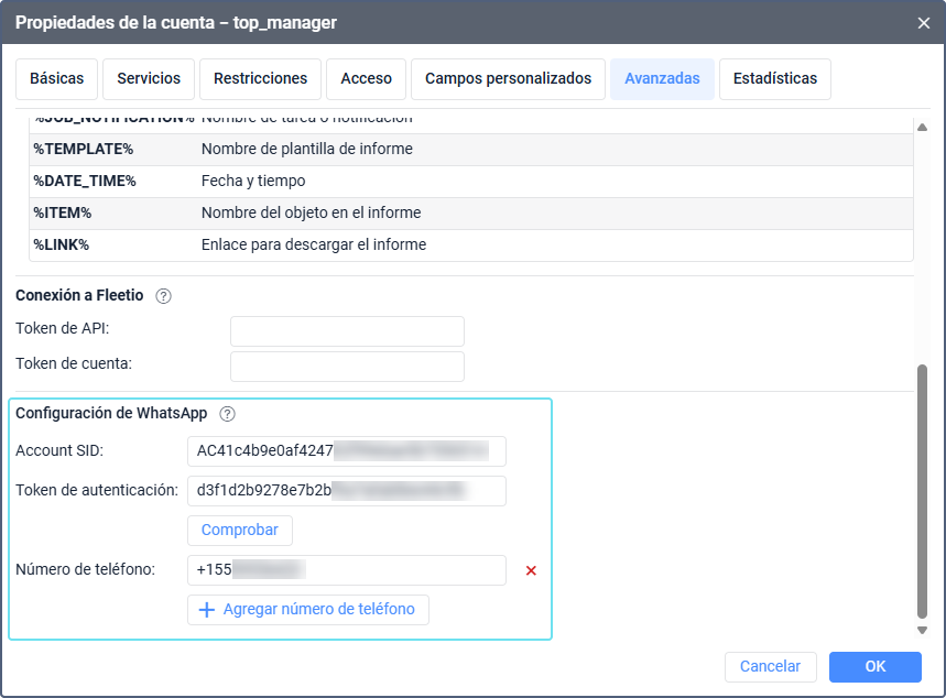 | Número de teléfono | Uno o más números de teléfono del remitente de WhatsApp Business en formato internacional (por ejemplo, +155XXXXXXXX). El campo se hace disponible después de verificar las credenciales. |