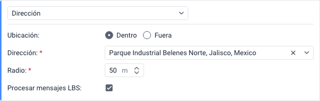 Esta condición se activa si la unidad se encuentra dentro o fuera de un lugar específico. Para configurarla, siga estos pasos: