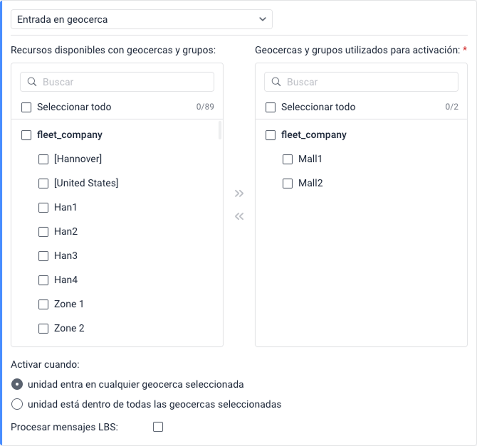 , mueva los elementos de la lista izquierda a la derecha. - En caso de seleccionar varias geocercas, seleccione cuándo activar la notificación: