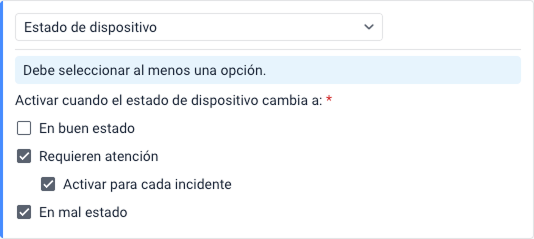 No puede seleccionar ambas opciones simultáneamente en una sola condición. Si necesita supervisar tanto la activación como la desactivación de la misma entrada, haga clic en Agregar condición para crear una segunda condición con el estado opuesto.