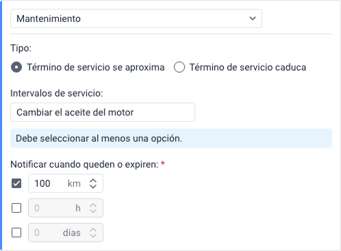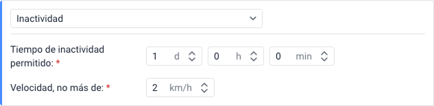 | Tiempo máximo de inactividad permitido | Tiempo máximo que la unidad puede estar detenida antes de que se dispare la notificación. El valor máximo es de 30 días. |
