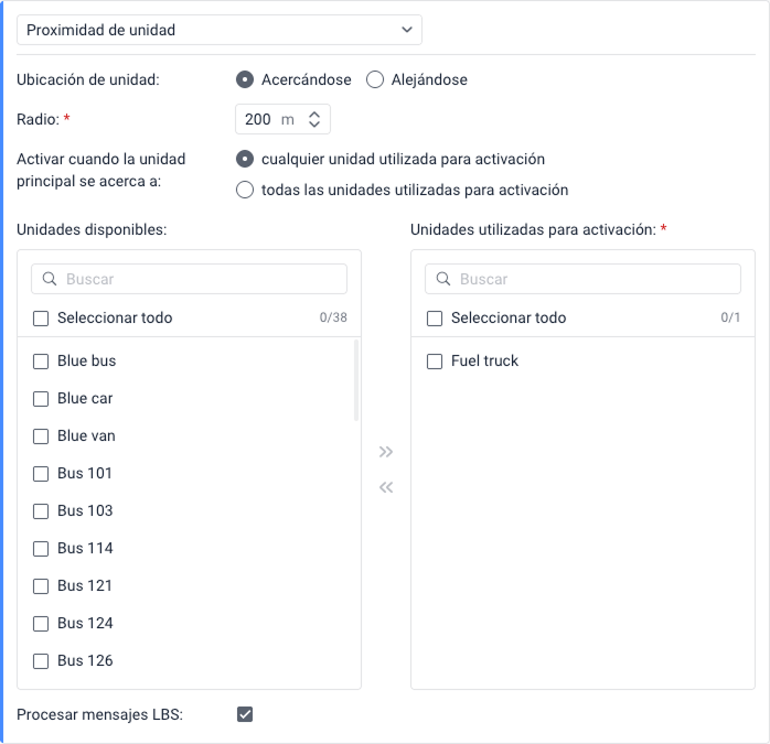 La notificación se activa cuando la unidad seleccionada en el panel izquierdo (la unidad principal) se acerca a todas las unidades seleccionadas en el paso 4 (las otras unidades) y la distancia entre ellas se vuelve menor que el valor especificado en el campo Radio. Es decir, si la unidad principal se acerca solo a algunas de las otras a la distancia requerida, la notificación no se activa.