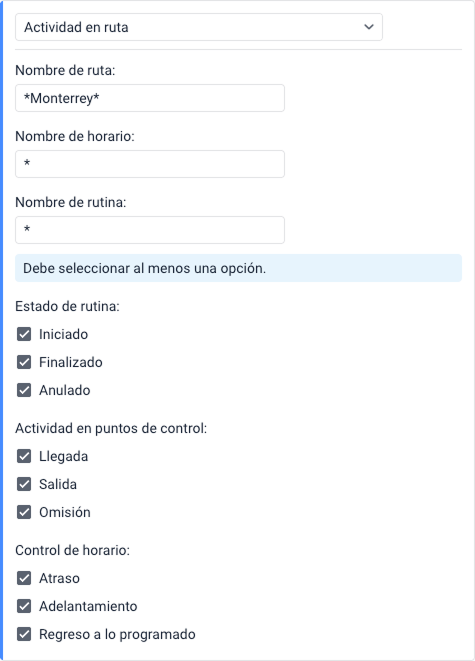 La notificación se activa cuando la unidad sale de cualquiera de las geocercas seleccionadas si previamente ha estado en todas ellas al mismo tiempo.