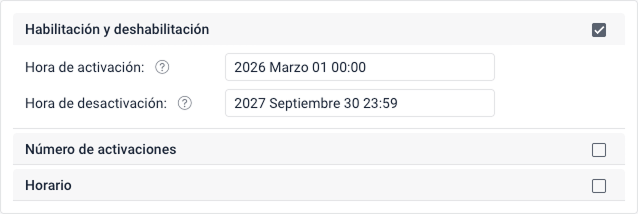 - Hora de desactivación: Fin de este período. Después de este momento, la notificación se deshabilita y no se puede activar.
