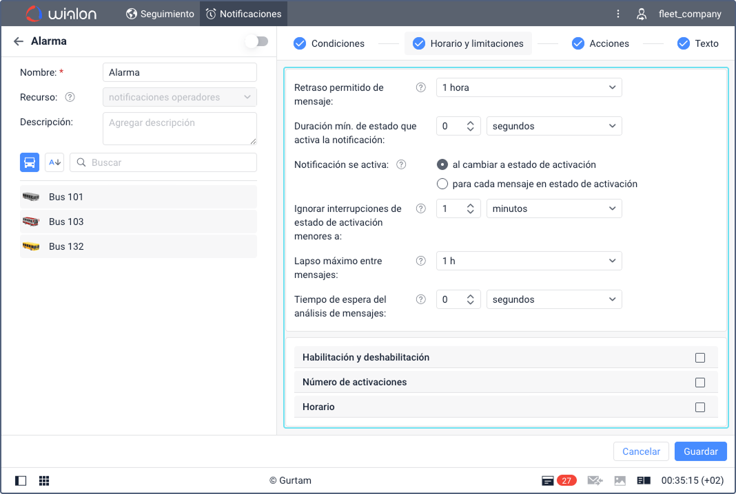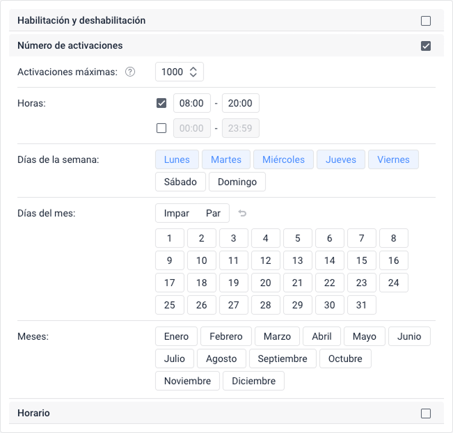 Puede configurar un horario para este parámetro. En este caso, el límite de activaciones se aplica solo a los intervalos especificados. Fuera de estos intervalos, la notificación no se activará en absoluto, independientemente de la actividad de la unidad.