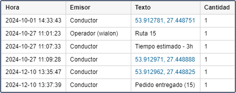 | Emisor | Conductor u operador (entre paréntesis se muestra el nombre del usuario). |