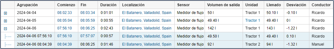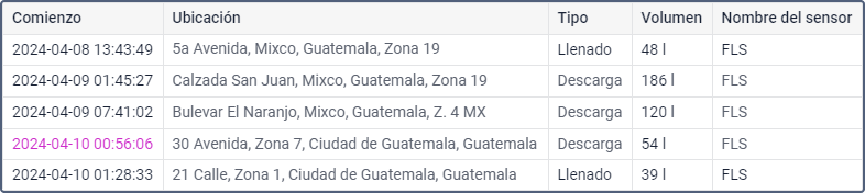 La tabla puede mostrar filas con llenados y descargas marcados como falsos. Para ello, la opción Mostrar eventos falsos debe estar activada en los ajustes del informe.
