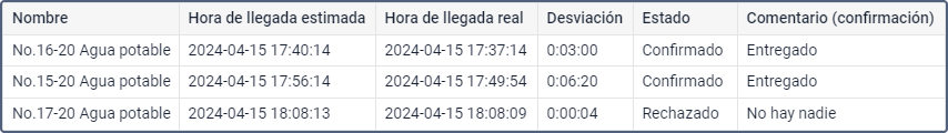 | Hora de llegada estimada | La hora aproximada de llegada al punto de entrega (según el cálculo del sistema). |