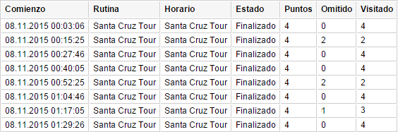 EstadoFinalizado (la rutina ha sido activada con éxito y se ha fijado la entrada en el último punto de control), no finalizado (la entrada en el último punto de control no ha sido detectada) o anulado (se ha expirado el término de vigencia de la rutina o ha sido eliminado de la tabla manualmente).