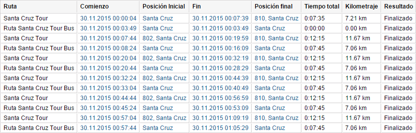 Si una unidad ha pasado por unas rutas, a su base se puede generar el informe correspondiente. Este puede incluir las columnas que se describen a continuación.