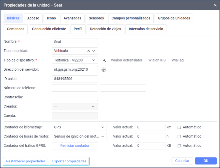 Los botones para restablecer y exportar las propiedades de la unidad se encuentran en la parte inferior de la pestaña Básicas.
