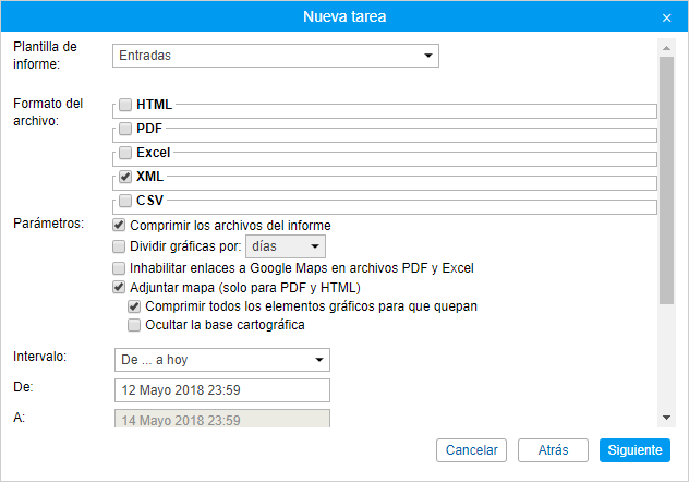 La tarea Enviar un informe por email puede emplearse para recibir automáticamente informes sobre la actividad de unidades de seguimiento (o usuarios) a su correo electrónico sin entrar en el sistema.