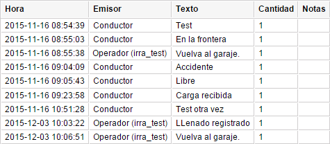 | Emisor | Conductor u operador (entre paréntesis se muestra el nombre del usuario). |