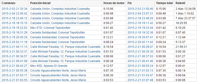 | Ralentí | El intervalo de tiempo, durante el cual la unidad estaba parada con el motor encendido (ralentí). |