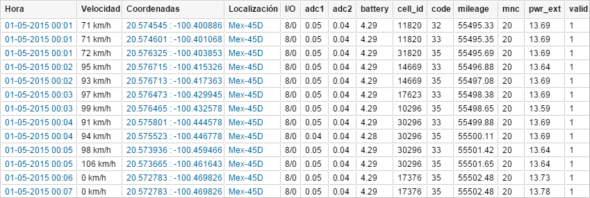 | Coordenadas | Las coordenadas de la unidad según el mensaje recibido. |