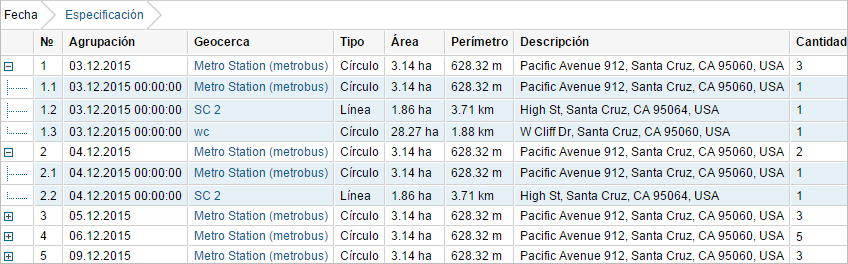 Tomemos el intervalo temporal de 3 a 9 de diciembre. De la tabla de abajo se ve, que, por ejemplo, el 3 de diciembre se han omitido 3 puntos y el 4 de diciembre — 2. El hecho de no haber en la tabla los días 7 y 8 de diciembre significa, que no se ha omitido ni una geocerca estos dos días. Las celdas con los nombres de geocercas se muestran azules, lo que permite mover a los primeros puntos de estas geocercas en el mapa por un clic en sus nombres.