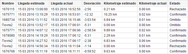 | Visitados sin estado | Se ha registrado la llegada del mensajero a las direcciones de pedidos, no se ha ajustado ningún estado. |
