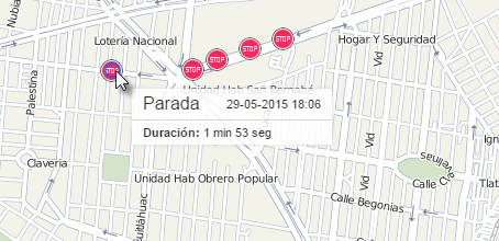 Se considera una parada uno o más mensajes seguidos con velocidad nula o insignificante. Las paradas pueden fijarse en semáforos, cruces, embotellamientos, etc.