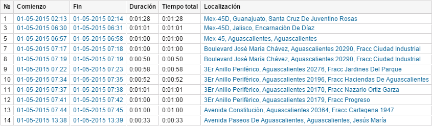 | Localización | La ubicación de la unidad en el momento de una parada. Si no hay información de dirección, en esta columna se ponen rayas. |