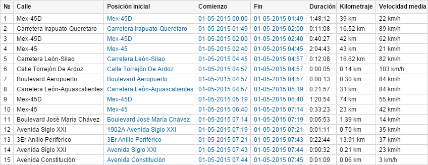 Por un clic en una fila azul de la tabla se puede mover al lugar, donde la unidad ha llegado a la calle o la ha dejado, o donde se ha alcanzado la velocidad máxima.