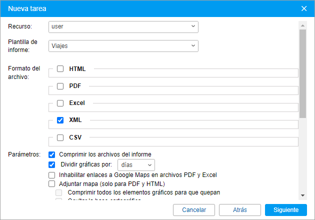 Marque el formato (los formatos) en que debe enviarse el informe. Están disponibles HTML, PDF, Excel, XML y CSV. Véase información detallada sobre los formatos de archivos y sus parámetros en la página Exportar informe a archivo.