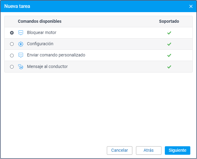 Escoja un comando que debe ser enviado a la unidad(es) y configure sus parámetros si es necesario. La lista contiene todos los comandos creados en las propiedades de unidades seleccionadas. Si todas las unidades admiten el comando, al lado de este se muestra el icono