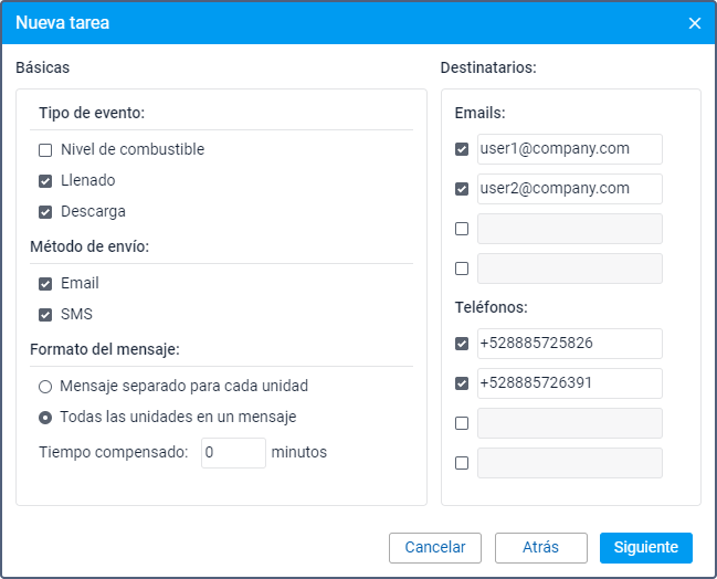 Una tarea de este tipo permite recibir la información sobre descargas, llenados y nivel de combustible en los mensajes de texto o al correo electrónico.