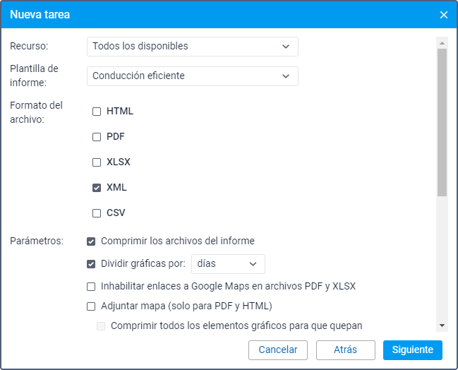 Formato del archivo* | Seleccione uno o varios formatos de archivos: HTML, PDF, Excel, XML, CSV. Si selecciona el formato PDF, puede indicar la orientación, tamaño y ancho de páginas. Si selecciona el formato CSV, puede indicar la codificación y separador, así como ocultar o mostrar los encabezados de columnas. Vea más detalles sobre formatos de informes en la página Exportación de informes de archivos. |