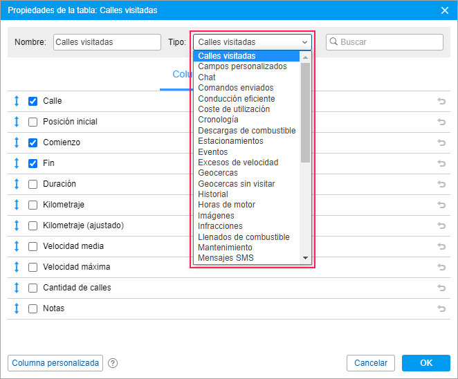 El tipo de tabla se escoge en la lista desplegable a la izquierda de su nombre. La cantidad de tipos disponibles depende de la plantilla de informe seleccionada.
