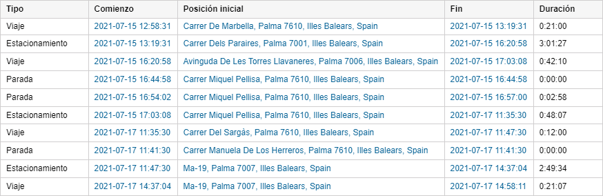 El sistema no calcula la duración del estado para llenados y descargas de combustible. Por esta razón en la tabla coinciden la hora y las posiciones inicial y final de un llenado/descarga y para la duración se da el valor nulo.
