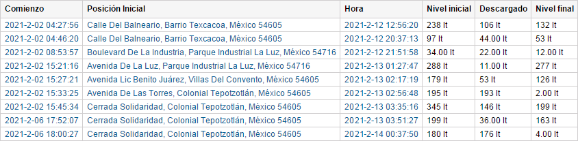 En esta tabla de informe se muestra dónde y cuándo se ha descargado el combustible de la unidad. Las descargas se detectan durante las paradas y estacionamientos, así como durante el movimiento de la unidad si la opción Detectar descargas de combustible en movimiento está activada. Los parámetros para este informe se configuran en los ajustes de sensores del nivel de combustible.