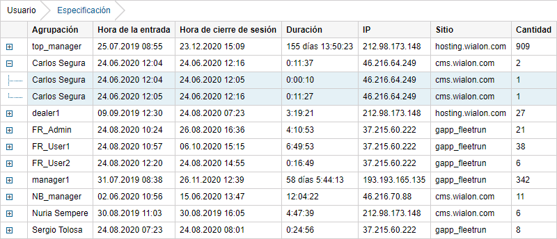 A la tabla Entradas se puede aplicar tales ajustes como agrupación, clasificación, especificación, numeración de líneas, la línea Total, limitaciones de tiempo. Por defecto, los datos en la tabla están agrupados por usuario.
